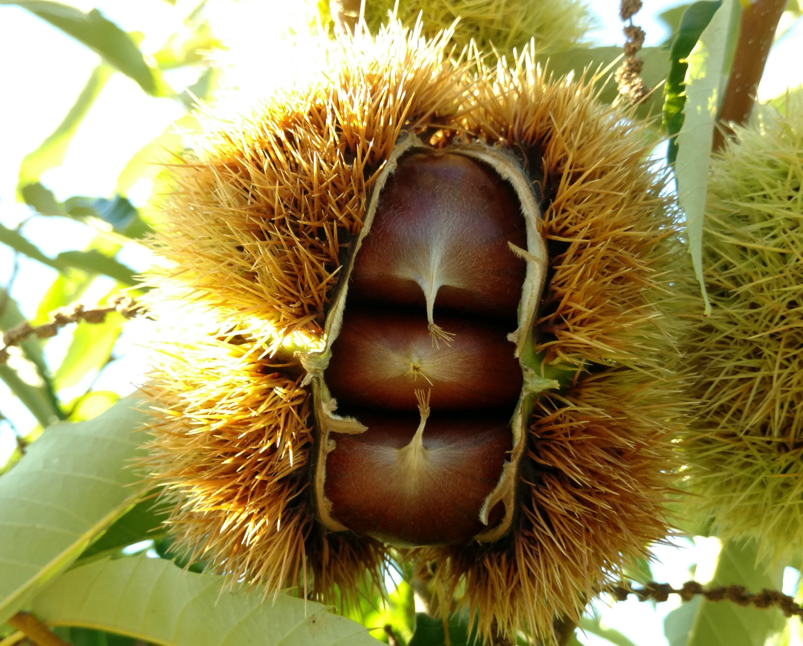 As the growing season continues, the chestnut trees go from bloom to developing the chestnuts inside the burr. The burr is a spiky protective growth providing a safe place for the nuts to develope until the nuts are mature.